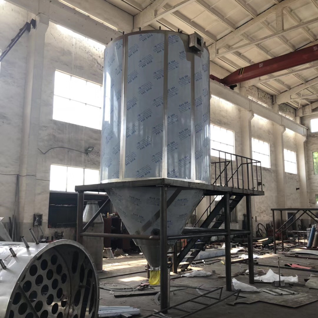 Po przefiltrowaniu i podgrzaniu gorące świeże powietrze wchodzi do dystrybutora powietrza w górnej części komory suszenia, rozprowadzane spiralnie równomiernie od góry do dołu.W tym samym czasie płyn zasilający jest pompowany do górnego rozpylacza, a następnie rozpylany w celu uzyskania bardzo drobnej mgiełki.Przez krótki czas bezpośredniego kontaktu z gorącym powietrzem wilgoć od razu odparowuje, ciało stałe pozostaje w postaci proszku.Suchy proszek będzie odprowadzany w sposób ciągły z dna wieży suszącej i kolektora cyklonowego, powietrze wylotowe zostanie wyrzucone po oczyszczeniu.