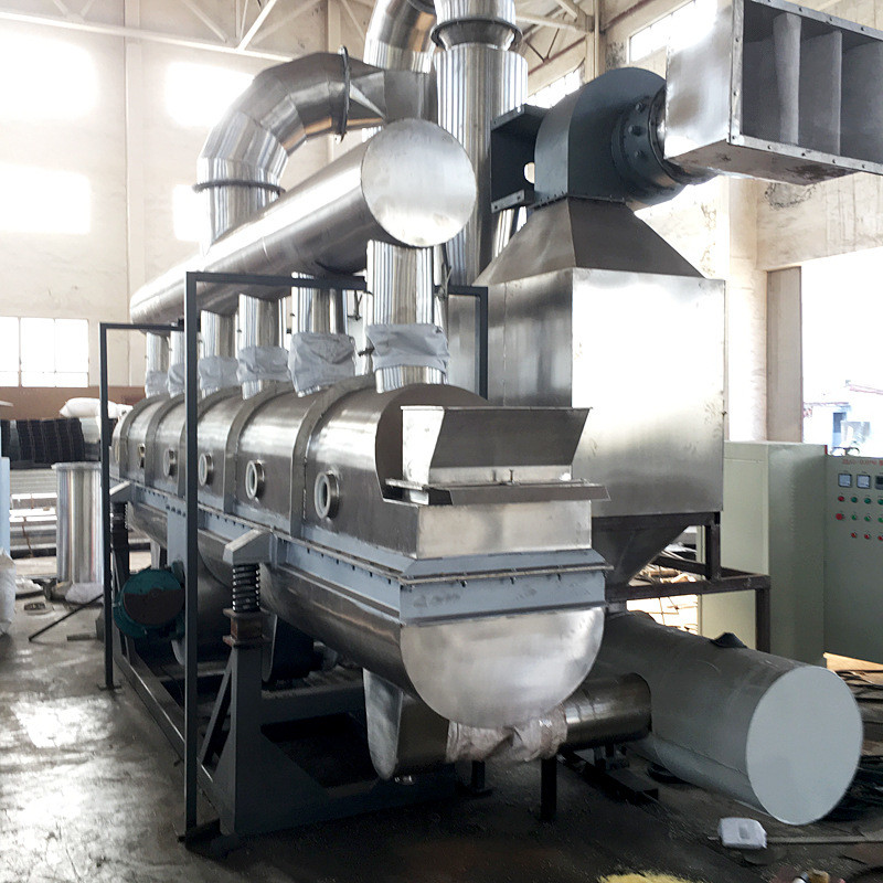 Seria wibracyjnych suszarek fluidalnych WKS to urządzenia do ciągłego suszenia cząstek nieklejących.Jego zasada działania polega na tym, że zimne powietrze jest filtrowane przez filtr, a następnie trafia do nagrzewnicy i zostaje podgrzane do określonej temperatury, następnie gorące powietrze jest rozprowadzane do dolnego złoża wieloma wlotami i przepływa w górę przez perforowaną płytę złoża.Materiał trafia równomiernie do łoża przez podajnik ślimakowy, pod działaniem siły wibracji materiał przesuwa się do przodu w sposób ciągły w kierunku poziomym, natomiast ulega wymianie ciepła z gorącym powietrzem napływającym od dołu, wilgoć materiału szybko odparowuje, a mokre powietrze jest odprowadzane z wentylatora wyciągowego, a materiał jest całkowicie suszony i odprowadzany z portu wylotowego.
