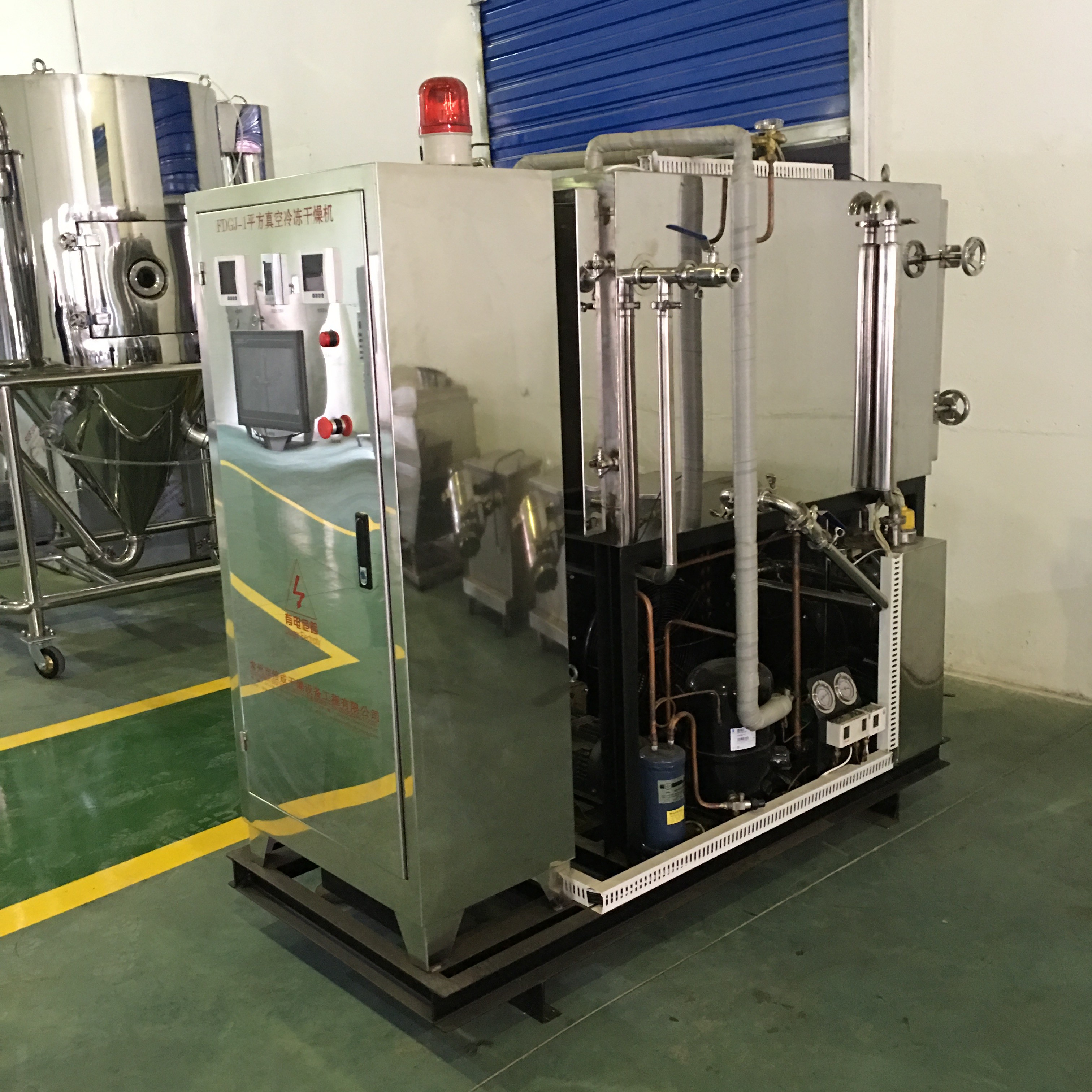 Liofilizator składa się z układu chłodniczego, układu próżniowego, układu grzewczego i układu sterowania oprzyrządowaniem elektrycznym.Główne elementy to piec, skraplacz, agregaty chłodnicze, pompy próżniowe, urządzenia grzewcze/chłodzące.Jego zasadą działania jest zamrożenie materiału poniżej określonej temperatury, a następnie w warunkach próżni stan stały wody (lód) jest bezpośrednio sublimowany w parę wodną i odprowadzany w celu uzyskania suchych przedmiotów.