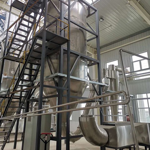 Surowiec w postaci cieczy lub pasty jest rozpylany na niewielką kroplę za pomocą sprasowanego spryskiwacza za pomocą ciśnienia pompy membranowej i szybko schnie dzięki obfitej wymianie ciepła (10-90sek.).Większość granulek proszku jest zbierana z wylotu zrzutu na dnie suszarki.Zmarnowane powietrze i drobny proszek są oddzielane przez cyklon, zmarnowane powietrze jest odprowadzane z wentylatora wyciągowego, a drobny proszek jest zbierany na dnie cyklonu.Na wylocie znajduje się odkurzacz drugiej klasy;dlatego stopień odzysku gotowej granulki proszku może wynosić od 96% do 98%.